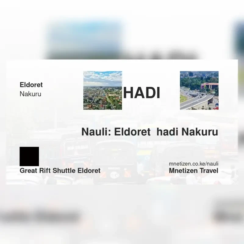 The fare from Eldoret to Nakuru with Great Rift Shuttle Eldoret is . Prices may vary during holidays and school terms.