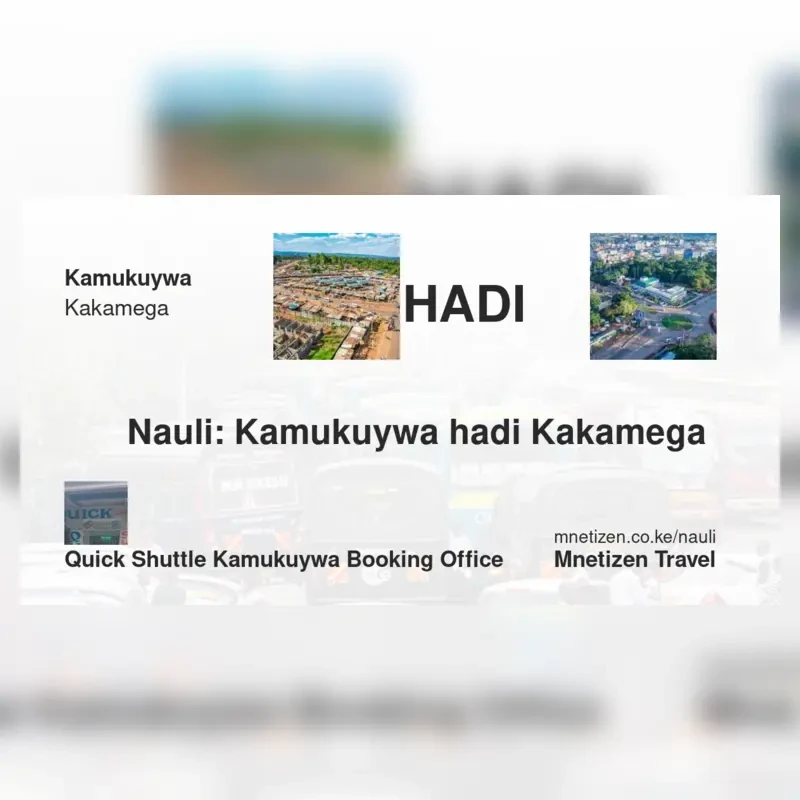 Top operators on this route include Quick Shuttle kamukuywa booking Office. Check current schedules and fares.