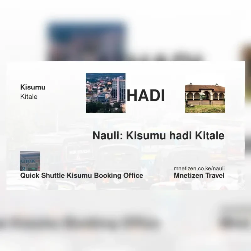 Quick shuttle Kisumu Booking office is a top choice for this route. Alternatives include: Quick shuttle Kisumu Booking office . For safe online booking, call 0746934915.