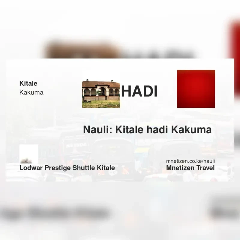 Top operators on this route include Quick Shuttle Kitale Booking Office, Tripping shuttle kitale , Lodwar Prestige shuttle kitale , Eldoret express executive kitale , Royal Rift Shuttle kitale , Lodwar Classic shuttle kitale . Check current schedules and fares.