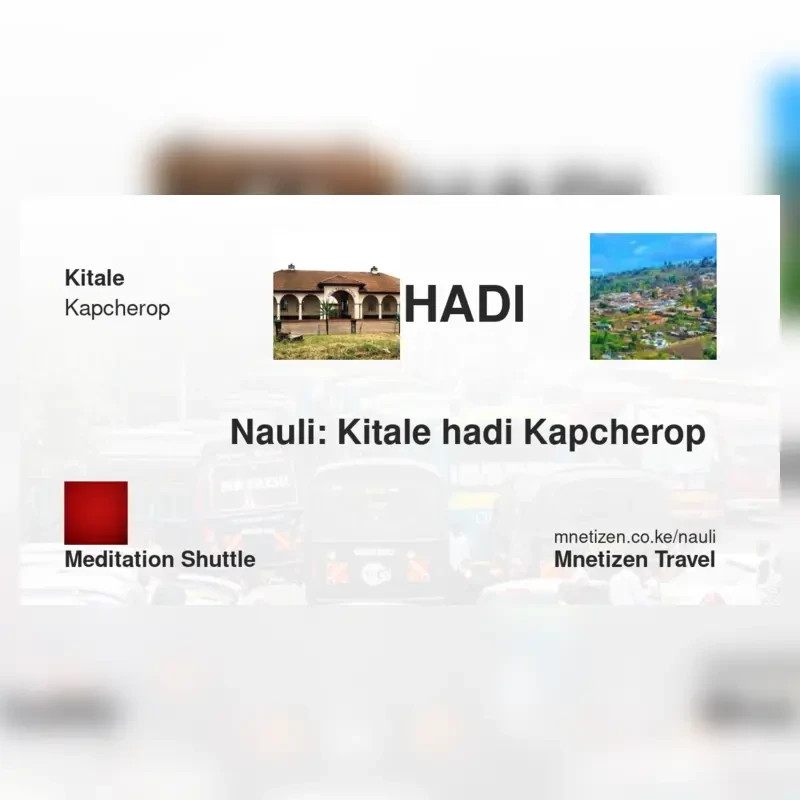 | Kitale Maili nane / sibanga | Meditation shuttle Shuttle | – | – | ksh 150 Book |