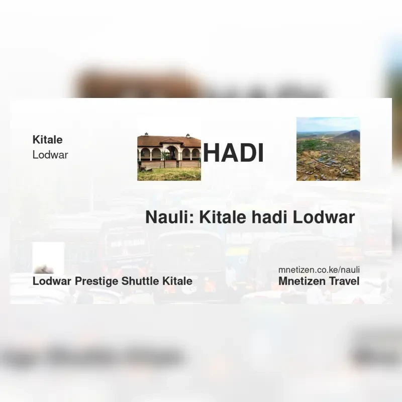 Top operators on this route include Quick Shuttle Kitale Booking Office, Eldoret express executive kitale , Lodwar Prestige shuttle kitale , Royal Rift Shuttle kitale , Tripping shuttle kitale , Cherangany Travellers SACCO ktl, Lodwar Classic shuttle kitale . Check current schedules and fares.