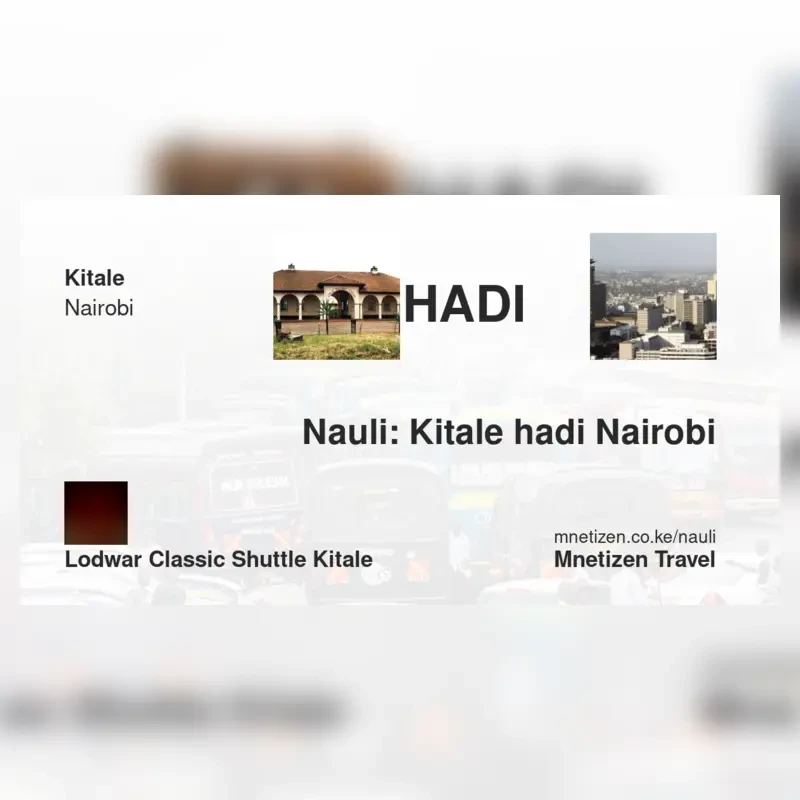 | Kitale Nairobi | Nnus shuttle kitale Shuttle | 385 | 8hours |