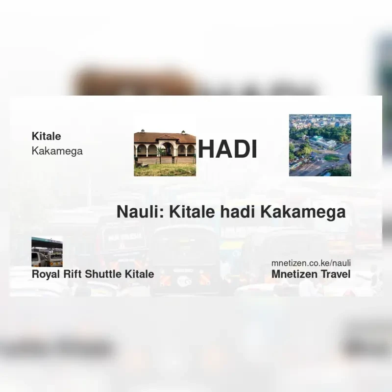 The fare from Kitale to Kakamega with Royal Rift Shuttle kitale is . Prices may vary during holidays and school terms.