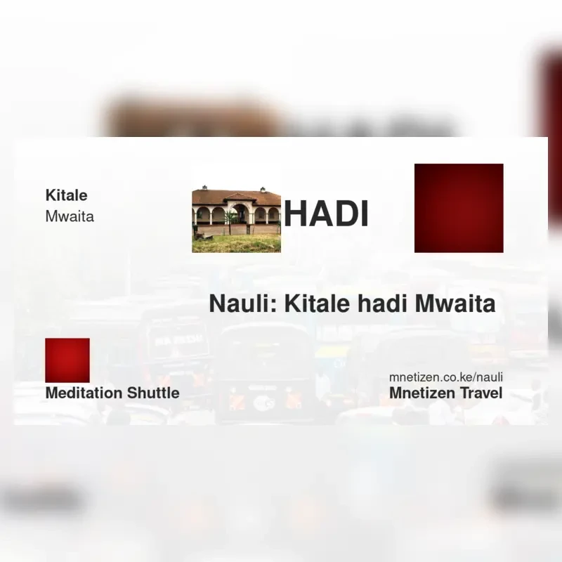 | Kitale Maili nane / sibanga | Meditation shuttle Shuttle | – | – | ksh 150 Book |