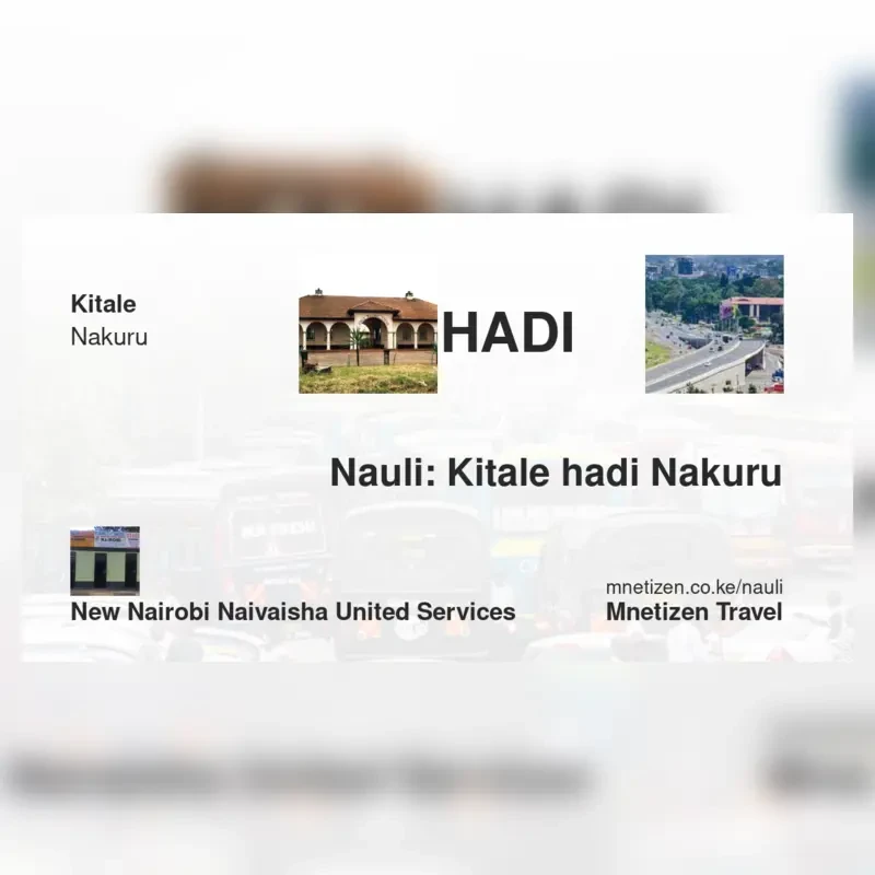 The fare from Kitale to Nakuru with New Nairobi naivaisha United Services is . Prices may vary during holidays and school terms.