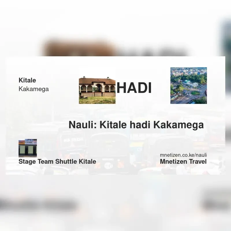 The fare from Kitale to Kakamega with STAGE TEAM SHUTTLE KITALE is . Prices may vary during holidays and school terms.