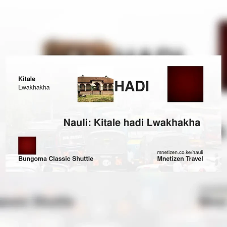 The fare from Kitale to Lwakhakha with Bungoma classic shuttle is . Prices may vary during holidays and school terms.