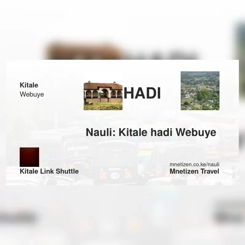 The fare from Kitale to Webuye with Kitale Link shuttle is . Prices may vary during holidays and school terms.
