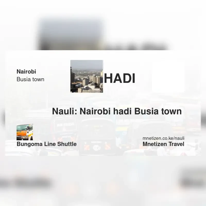 The fare from Nairobi to Busia Town with bungoma line shuttle is . Prices may vary during holidays and school terms.
