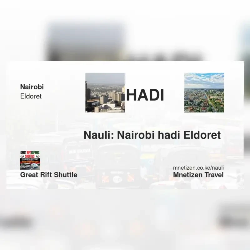 The fare from Nairobi to Eldoret with Great rift shuttle is . Prices may vary during holidays and school terms.