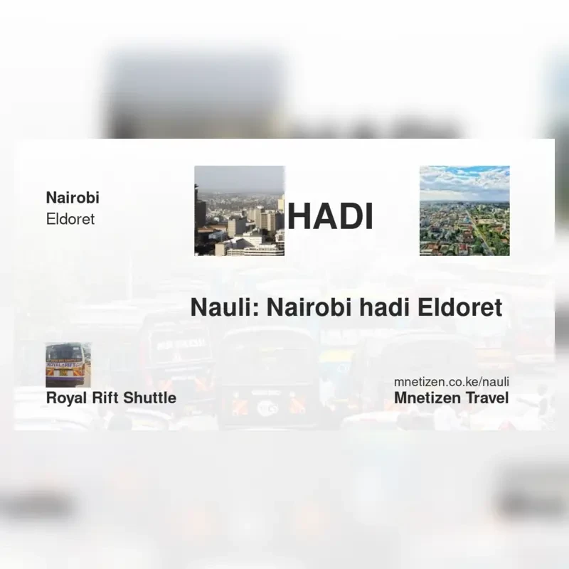 The fare from Nairobi to Eldoret with Royal Rift Shuttle is . Prices may vary during holidays and school terms.
