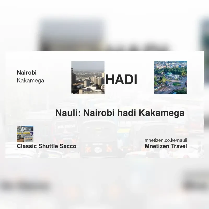 The fare from Nairobi to Kakamega with Classic Shuttle Sacco is . Prices may vary during holidays and school terms.