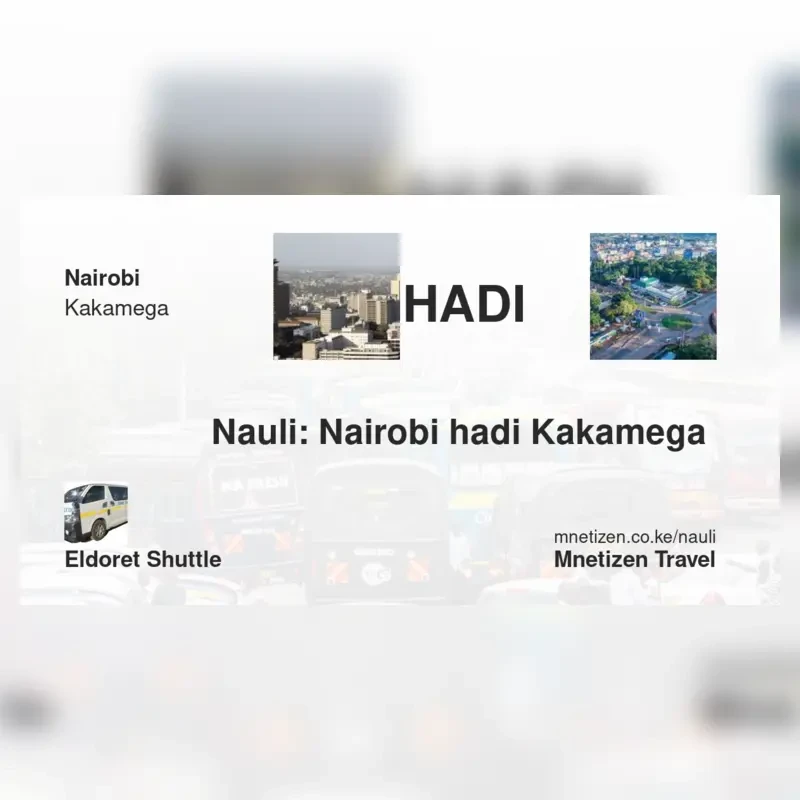 The fare from Nairobi to Kakamega with Eldoret Shuttle is . Prices may vary during holidays and school terms.