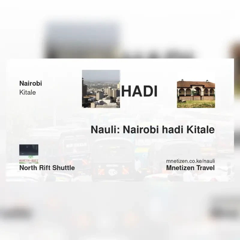 The fare from Nairobi to Kitale with North Rift Shuttle is . Prices may vary during holidays and school terms.