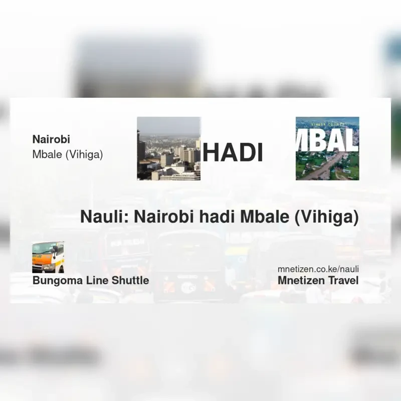The fare from Nairobi to Mbale (Vihiga) with bungoma line shuttle is . Prices may vary during holidays and school terms.