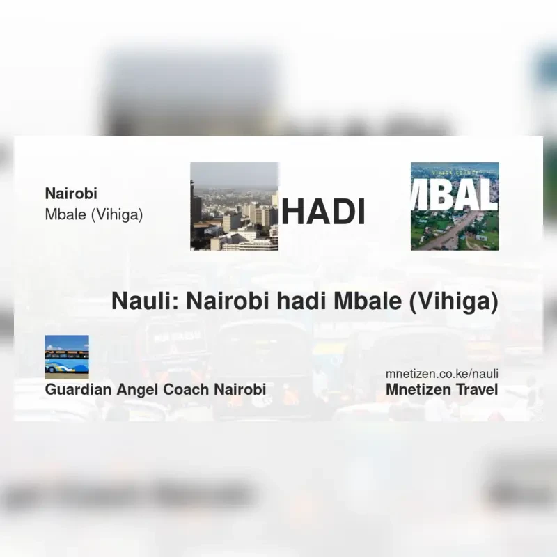 The fare from Nairobi to Mbale (Vihiga) with Guardian Angel Coach Nairobi is . Prices may vary during holidays and school terms.