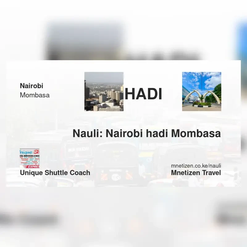 The fare from Nairobi to Mombasa with Unique Shuttle Coach is . Prices may vary during holidays and school terms.