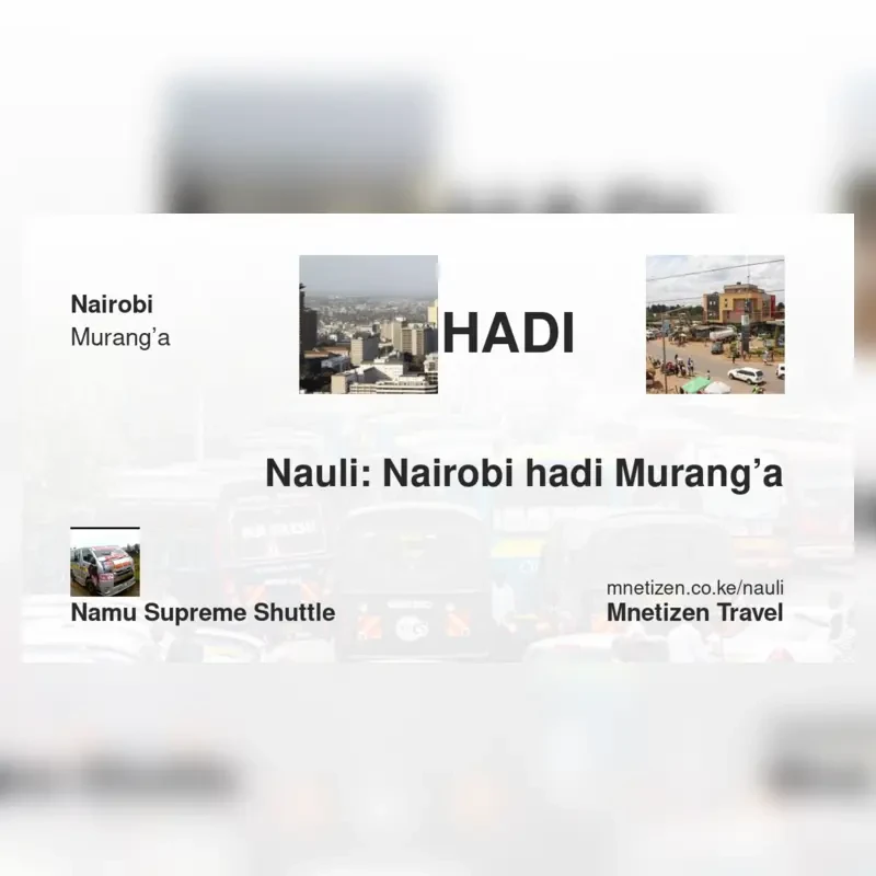 The fare from Nairobi to Murang’a with Namu Supreme Shuttle is . Prices may vary during holidays and school terms.