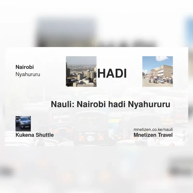 | Nairobi Nyahururu | Kukena shuttle Shuttle | – | – |