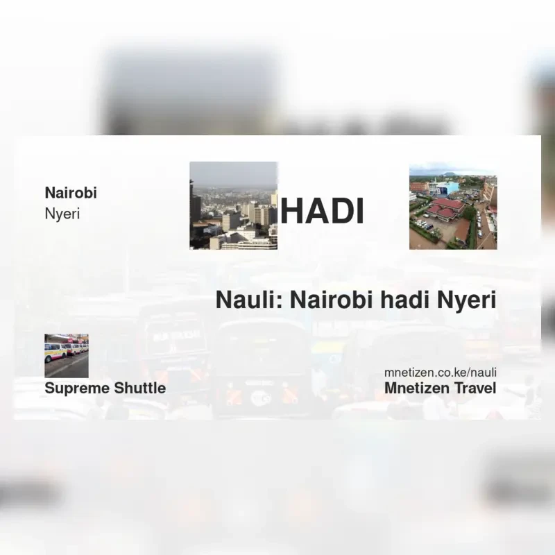 The fare from Nairobi to Nyeri with Supreme Shuttle is . Prices may vary during holidays and school terms.