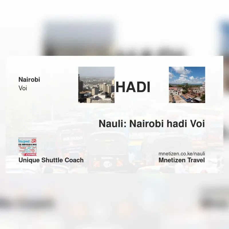 The fare from Nairobi to Voi with Unique Shuttle Coach is . Prices may vary during holidays and school terms.