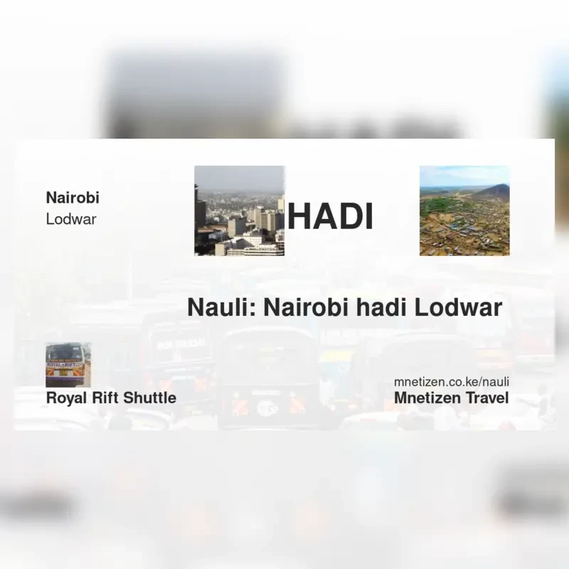 | Nairobi Lodwar | Royal rift shuttle Shuttle | 600 Kms | 11hrs 30mins | ksh 3,500 Book |