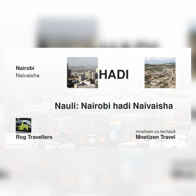 The fare from Nairobi to Naivaisha with Rog Travellers is . Prices may vary during holidays and school terms.