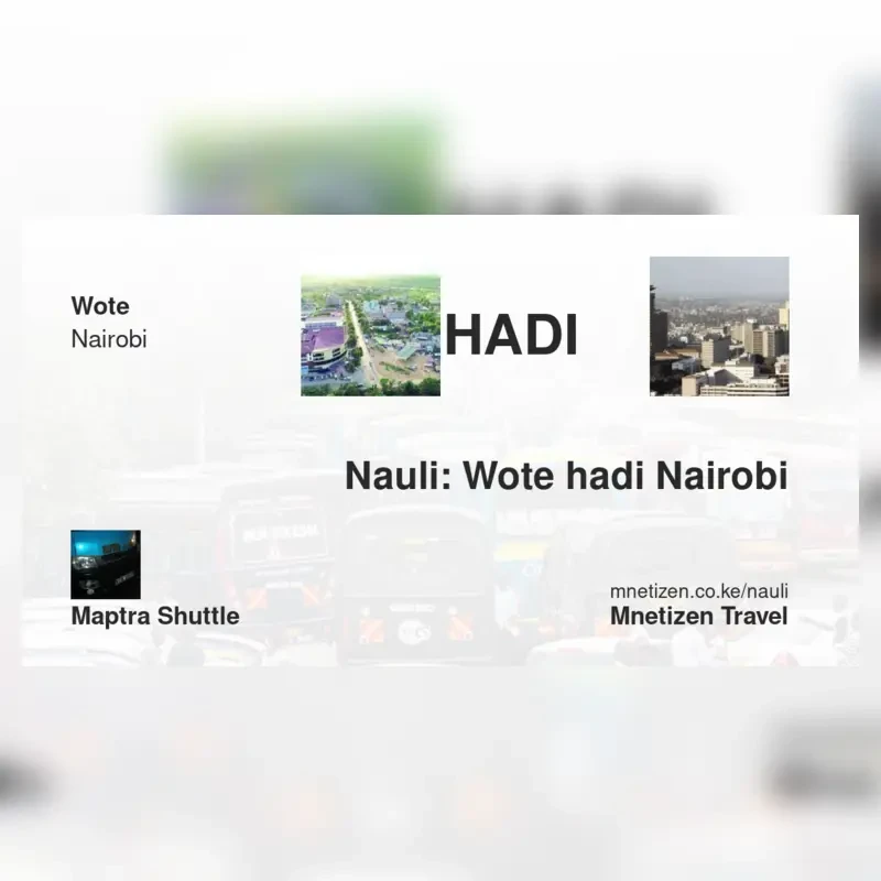 | Nairobi Wote | Maptra shuttle Shuttle | – | – | ksh 500 Book |