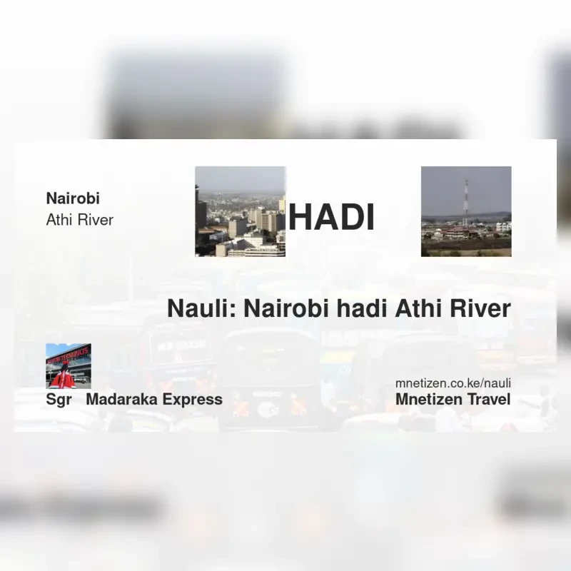| Nairobi Athi river | Sgr - madaraka express Train | 30 Kms | 15 mins | ksh 90 Book |